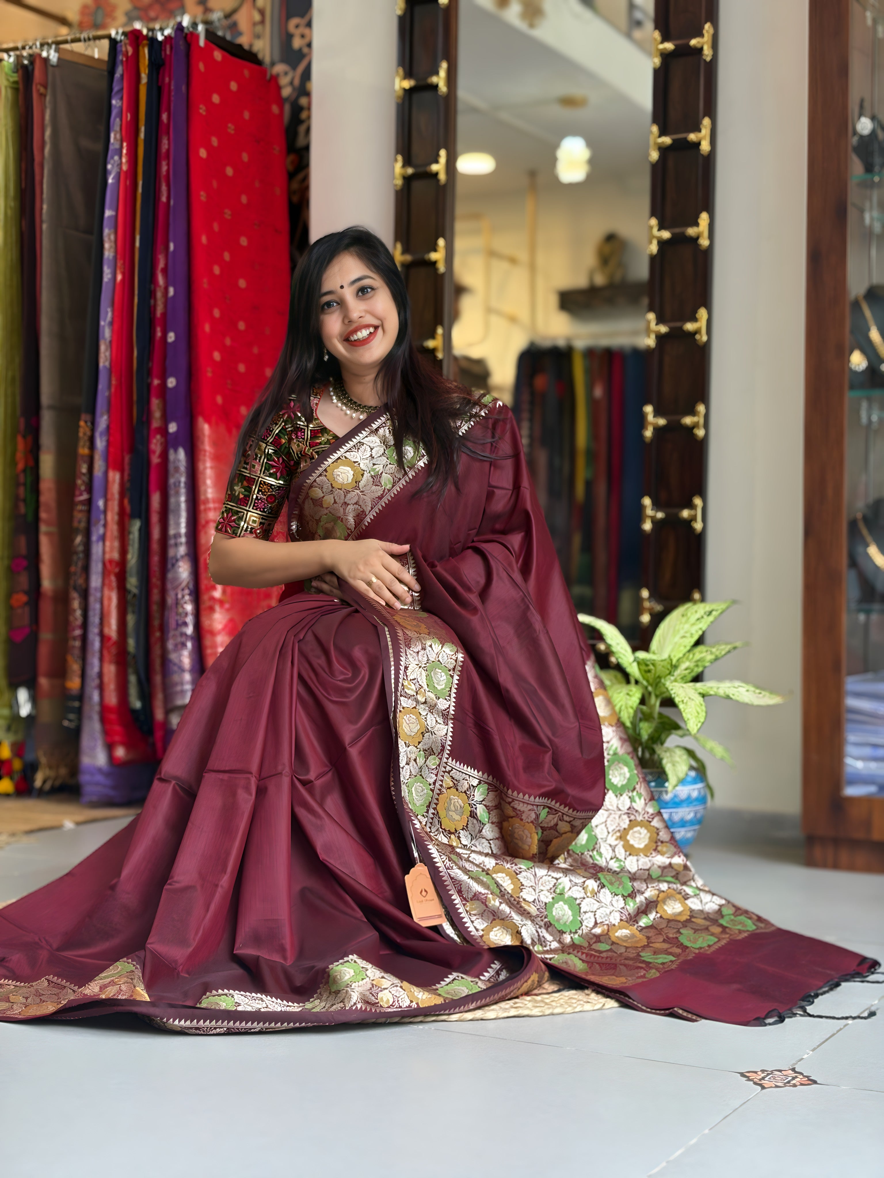 This exquisite Kalamkari Nizam Border Saree is a masterpiece of traditional artistry and royal elegance. The body is adorned with intricate hand-drawn or block-printed Kalamkari motifs, narrating timeless tales through rich natural colors. The Nizam-style border, woven with fine zari, adds a regal touch reminiscent of the opulence of Hyderabad’s Nizam era. Perfect for festive occasions, weddings, and cultural gatherings, this saree blends heritage with sophistication. Crafted from premium silk/cotton-silk blend, it drapes gracefully, ensuring a luxurious feel and an everlasting impression.